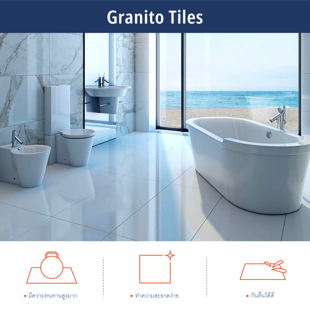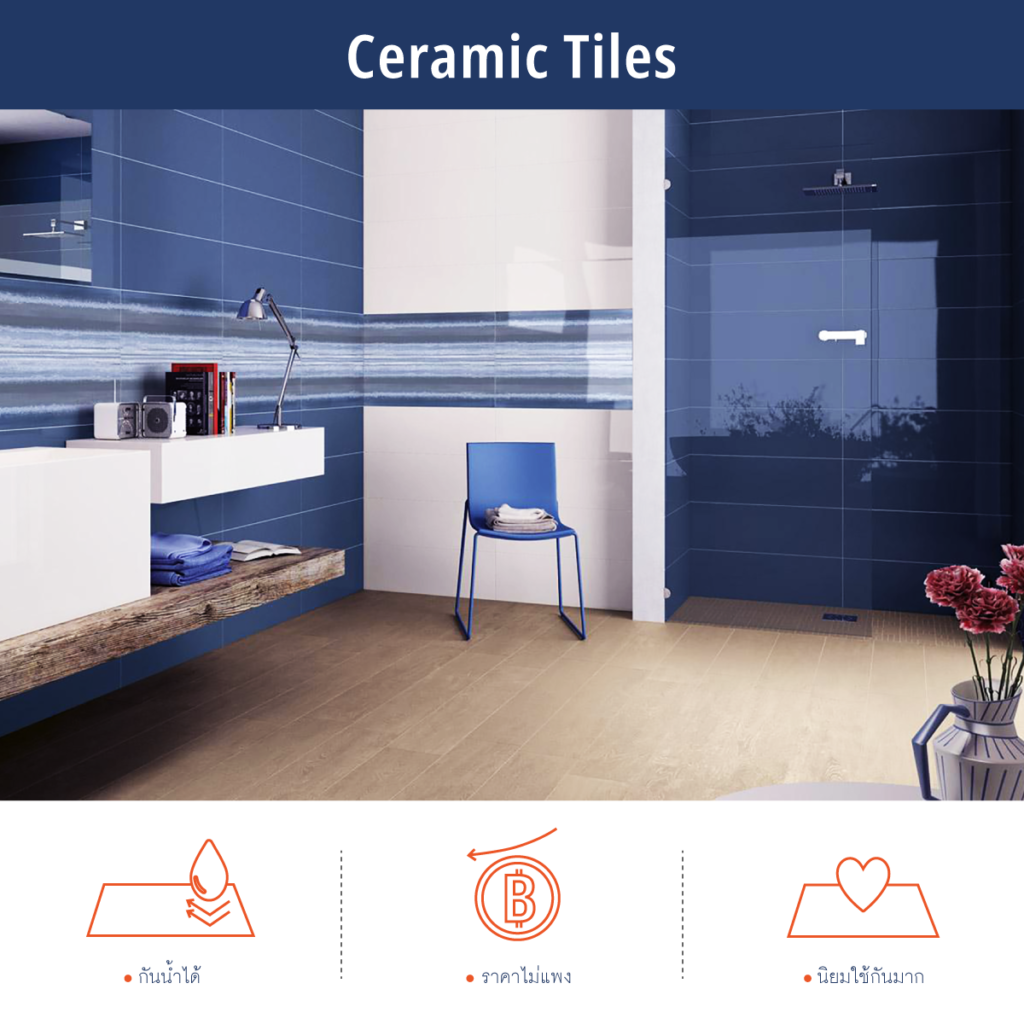 กระเบื้องที่เหมาะมาทำกระเบื้องห้องน้ำมากที่สุดคือกระเบื้องแกรนิตโต้ เนื่องจากมีความทนทานสูงมากทำความสะอาดง่าย และยังสามารถกันลื่นได้ดี รองลงมาคือกระเบื้องเซรามิค ซึ่งเป็นกระเบื้องดินเผาเคลือบเซรามิค กันน้ำได้ แม้จะไม่ทนทานและกันลื่นได้เท่ากระเบื้องแกรนิตโต แต่ก็ราคาไม่แพง ทำให้คนนิยมใช้ปูพื้นห้องน้ำด้วยกระเบื้องเซรามิคกันค่อนข้างมาก