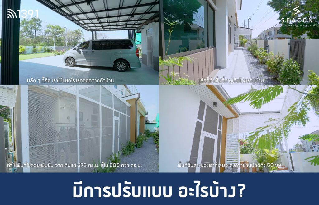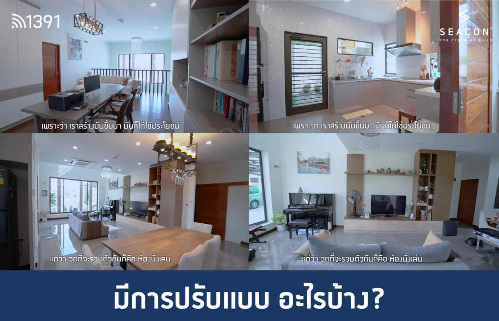 คุณกองกมล เที่ยงธีระธรรม : หลักๆ ก็คือ เราให้แยกโรงจอดรถออกจากตัวบ้าน ทำให้บ้านชั้นล่างมีพื้นที่ใหญ่ขึ้น  แล้วก็มีการลงฐานรากโดยรอบเลย แล้วก็ทำพื้นที่ทางเดินโดยรอบบ้าน ทำให้พื้นที่ใช้สอยเพิ่มขึ้น จากเดิมแค่ 372 ตร.ม. เป็น 500 กว่า ตร.ม. นอกจากนี้นะคะ ก่อนสร้างบ้านเราได้แจ้งความประสงค์ว่าเราต้องการติดตั้งระบบฟอกอากาศขนาดใหญ่ หรือ Ari Factory  ทางซีคอนก็ได้ให้ความร่วมมือเป็นอย่างดี พื้นที่ชั้นล่างของเราก็เลยจะสูงกว่าบ้านปกติถึง 50 ซม. แล้วก็มีการปรับแบบ โดยเฉพาะบัดใด จะต้องทอดยาวมากขึ้น เป็นต้นค่ะ