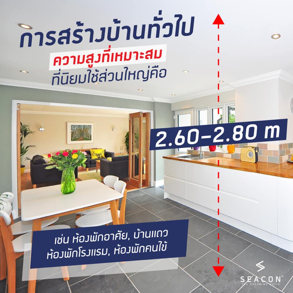สำหรับการสร้างบ้านทั่วไป ความสูงที่เหมาะสม นิยมใช้กันส่วนใหญ่คือ 2.60-2.80 เมตร แต่หากต้องการให้บ้านโปร่งขึ้น ก็อาจขยับความสูงเป็น 2.80-3.20 เมตร หรือบ้านไหนหลังใหญ่ต้องการความสูงเพิ่มขึ้นเป็น Double space ก็สามารถเพิ่มความสูงมากขึ้นได้ แต่อย่าลืมว่ายิ่งฝ้าเพดานสูงขึ้นเท่าไหร่ ค่าใช้จ่ายในการก่อสร้างก็ต้องเพิ่มมากขึ้นตามไปด้วยนะครับ เพราะผนังก็ต้องสูงขึ้น หน้าต่าง ประตูก็ต้องสูงขึ้น บันไดต้องขยายมากขึ้นตามไปให้เหมาะสมกัน อีกทั้งการติดตั้งแอร์ ผ้าม่าน ก็ต้องขนาดใหญ่ขึ้น ค่าใช้จ่ายสูงขึ้นเช่นกันครับ