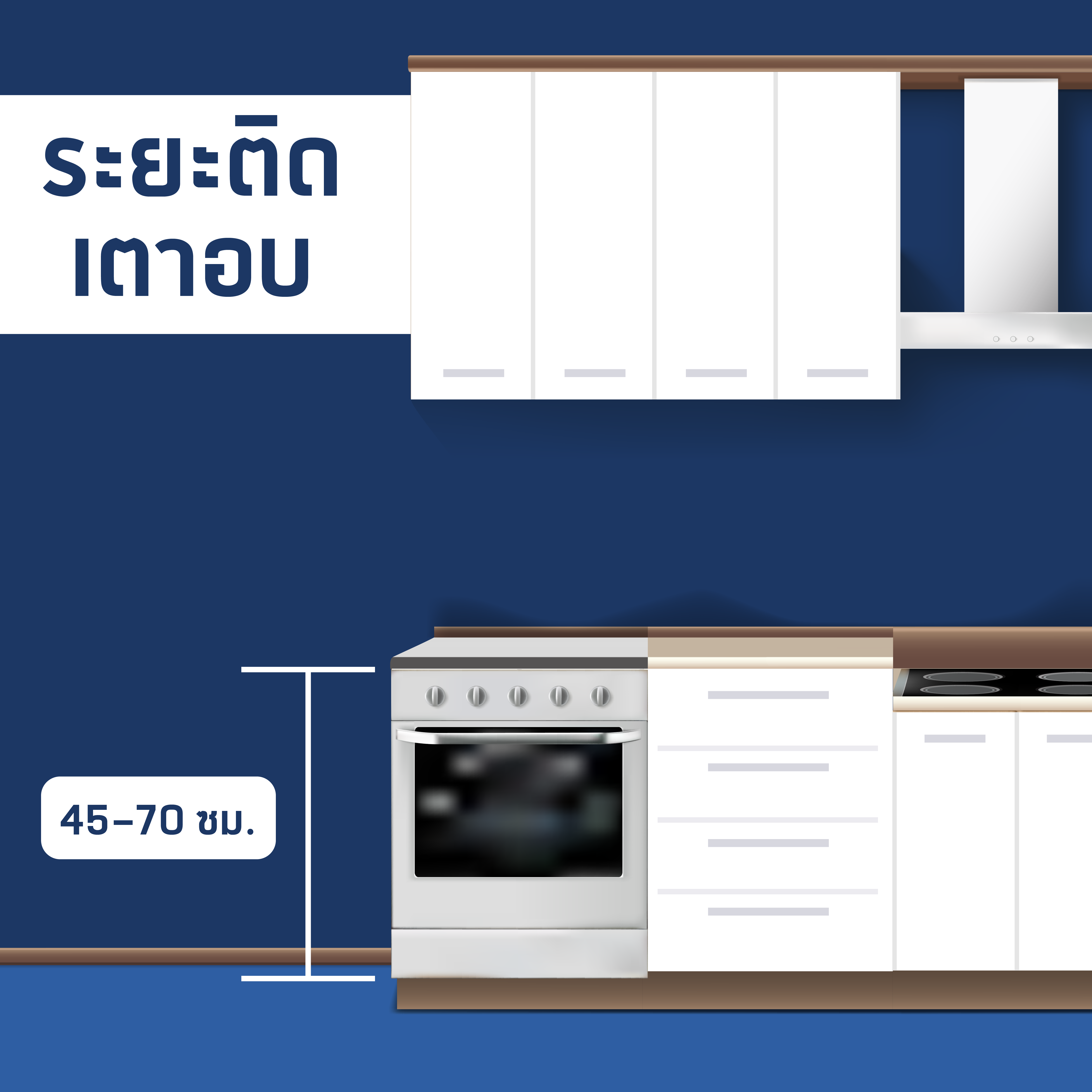 เตาอบ ควรสูงระดับเดียวกันกับเคาน์เตอร์ จะทำให้ใช้งานได้สะดวก หรือสามารถติดตั้งจากพื้นถึงฐานเตาอบ 45 – 70 ซม.