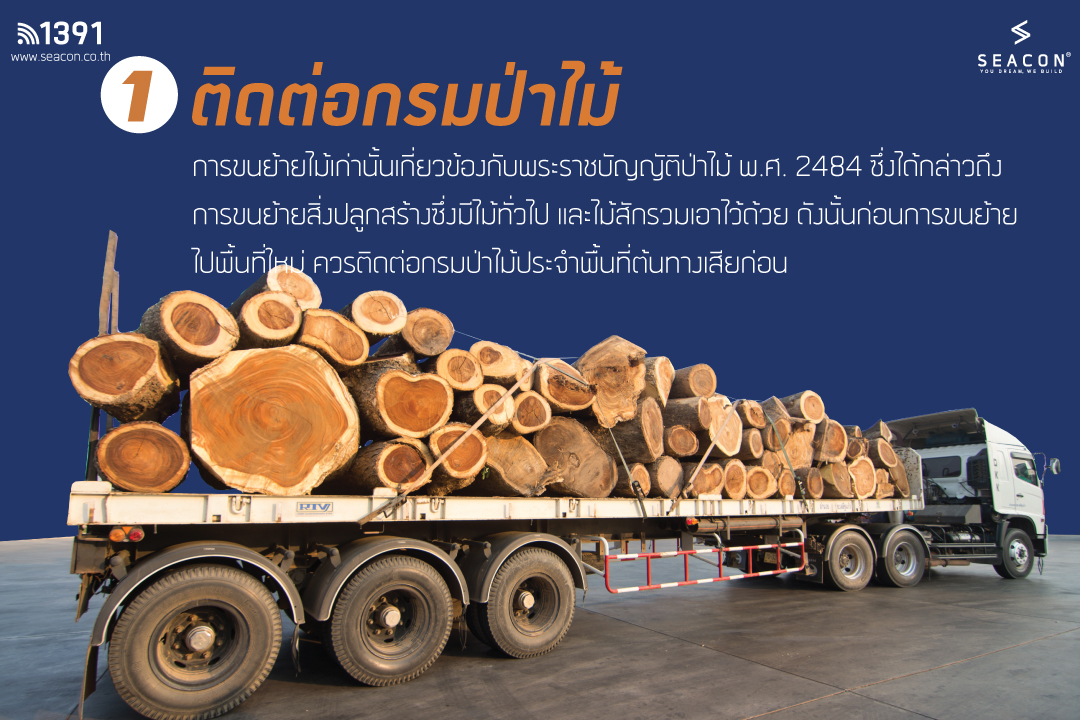 การขนย้ายไม้เก่านั้นเกี่ยวข้องกับพระราชบัญญัติป่าไม้ พ.ศ. 2484 ซึ่งได้กล่าวถึงการขนย้ายสิ่งปลูกสร้างซึ่งมีไม้ทั่วไป และไม้สักรวมเอาไว้ด้วย ดังนั้นก่อนการขนย้ายไปพื้นที่ใหม่ ควรติดต่อกรมป่าไม้ประจำพื้นที่ต้นทางเสียก่อน