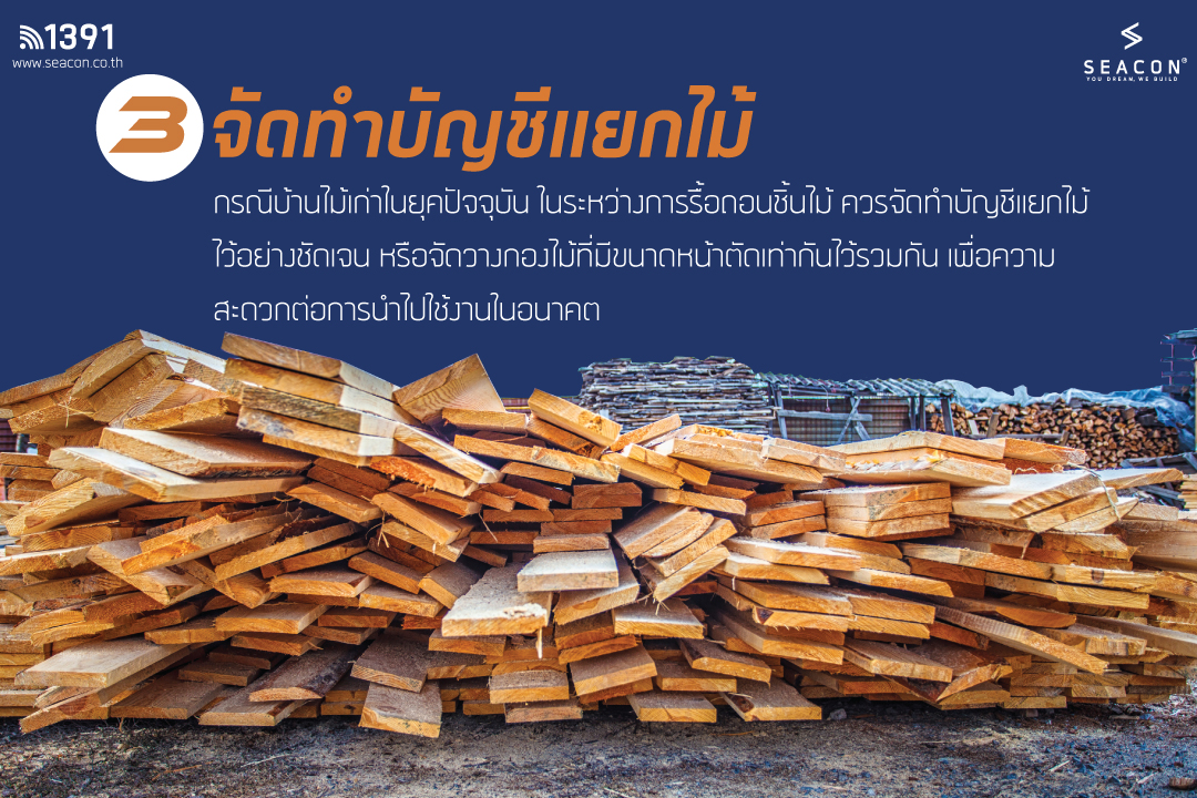กรณีบ้านไม้เก่าในยุคปัจจุบัน ในระหว่างการรื้อถอนชิ้นไม้ ควรจัดทำบัญชีแยกไม้ไว้อย่างชัดเจน หรือจัดวางกองไม้ที่มีขนาดหน้าตัดเท่ากันไว้รวมกัน เพื่อความสะดวกต่อการนำไปใช้งานในอนาคต