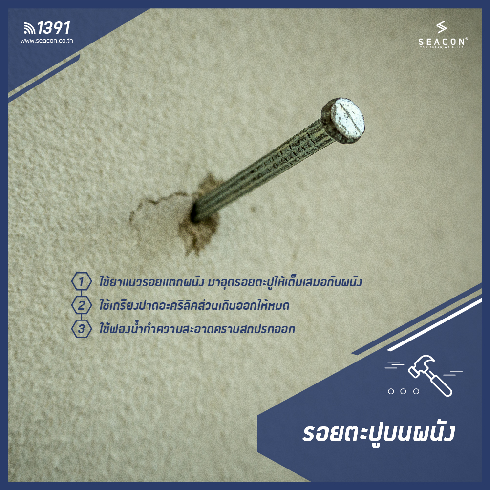บางคนอาจเคยตอกตะปูบนผนังเพื่อแขวนกรอบรูป สิ่งของตกแต่ง แต่เมื่อวันเวลาผ่านไปไม่ได้แขวนอะไรแล้ว ก็จะมีร่องรอยของรูตะปูฝากทิ้งไว้ ทำให้ไม่สวยงาม คุณสามารถซ่อมได้ด้วยการใช้ยาแนวรอยแตกผนังมาอุดรอยตะปูให้เต็มเสมอกับผนัง แล้วใช้เกรียงปาดอะคริลิคส่วนเกินออกให้หมด แล้วใช้ฟองน้ำทำความสะอาดคราบสกปรกออก หากสีหลุดลอก ควรทาสีผนังทับให้สวยงาม