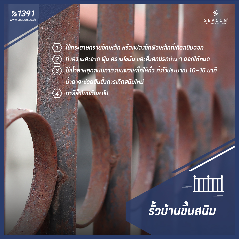 รั้วบ้านผ่านร้อน ผ่านฝนมามาก ถูกกัดกร่อนเกิดสนิม แก้ไขได้ง่าย ๆ ด้วยการใช้กระดาษทรายขัดเหล็ก หรือแปลงขัดผิวเหล็กที่เกิดสนิมออก จากนั้นทำความสะอาด ฝุ่น คราบไขมัน และสิ่งสกปรกต่าง ๆ ออกให้หมด ใช้น้ำยาหยุดสนิมทาลงบนผิวเหล็กให้ทั่ว ทิ้งไว้ประมาณ 10-15 นาที น้ำยาจะช่วยยับยั้งการเกิดสนิมใหม่ จากนั้นทาสีรั้วใหม่ทับลงไป ซึ่งควรทาสี 2 รอบเพื่อให้สีติดทนนาน