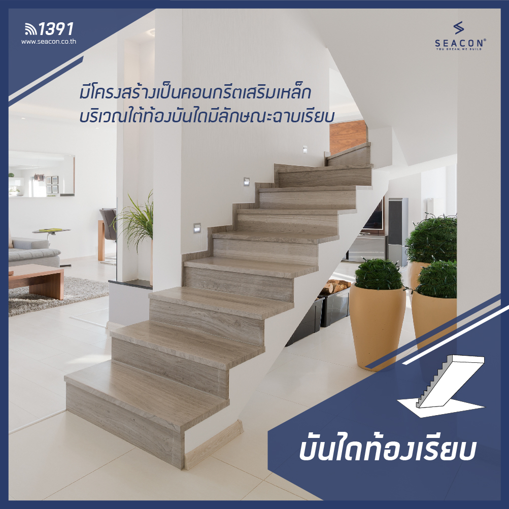 เป็นรูปแบบของบันไดที่ได้รับความนิยมมากที่สุด มีโครงสร้างเป็นคอนกรีตเสริมเหล็ก บริเวณใต้ท้องบันไดมีลักษณะฉาบเรียบ การก่อสร้างง่าย ไม่ยุ่งยาก มีช่างที่มีความชำนาญมาก