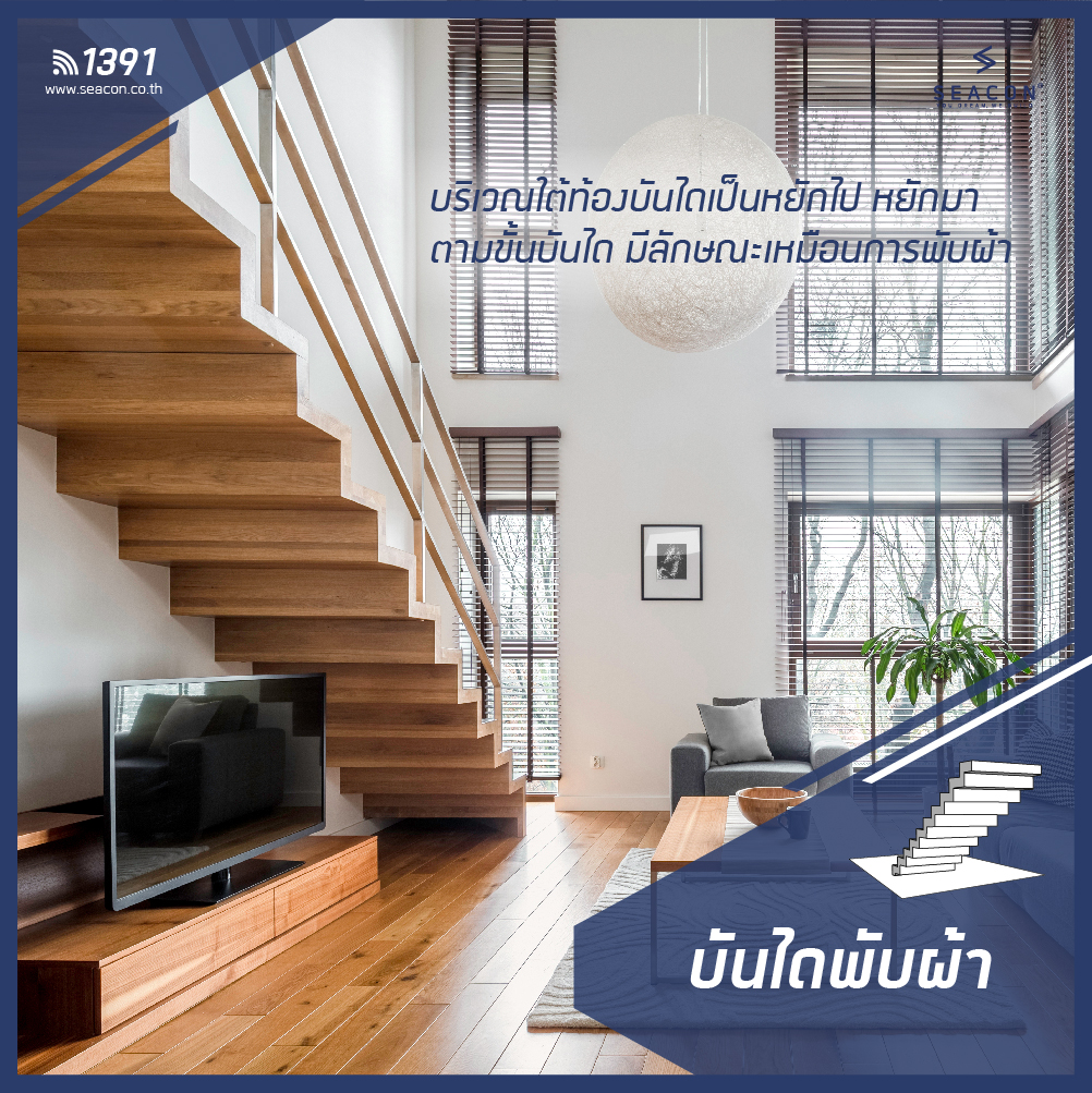 อาจฟังดูแปลกสักหน่อยว่าบันไดพับผ้า เนื่องจากบริเวณใต้ท้องบันไดเป็นหยักไป หยักมา ตามขั้นบันได มีลักษณะเหมือนกับการพับผ้า ช่วยให้บันไดดูมีมิติและสวยงามมากกว่าบันไดท้องเรียบ การก่อสร้างค่อนข้างยาก ต้องอาศัยช่างที่มีความชำนาญ