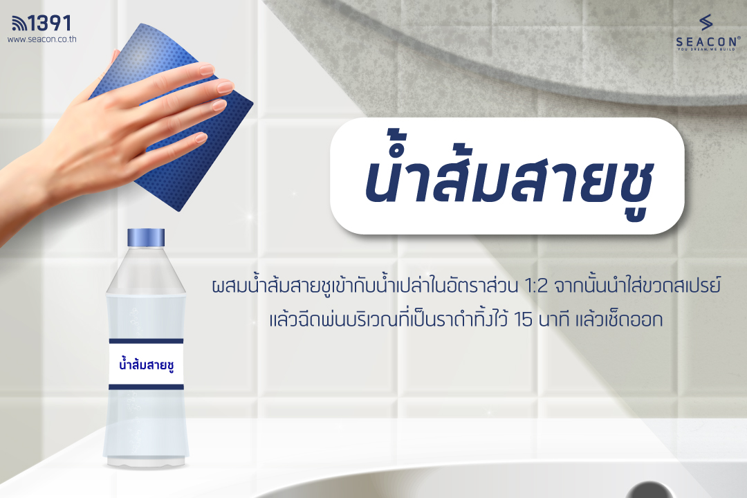 สิ่งที่ต้องมีติดบ้านไว้ นอกจากจะใช้ทำอาหารแล้ว ยังสามารถใช้ได้สารพัดประโยชน์ โดยก่อนที่จะนำมาใช้ขจัดคราบเชื้อรา สามารถทำการเจือจางโดยผสมน้ำส้มสายชู กับน้ำเปล่าในอัตราส่วน 1:2 ก่อน จากนั้นจึงนำไปใส่ขวดสเปรย์ เพื่อให้ฉีดพ่นได้อย่างสะดวก โดยสามารถฉีดทิ้งไว้ประมาณ 15 นาที แล้วเช็ดออกให้สะอาด