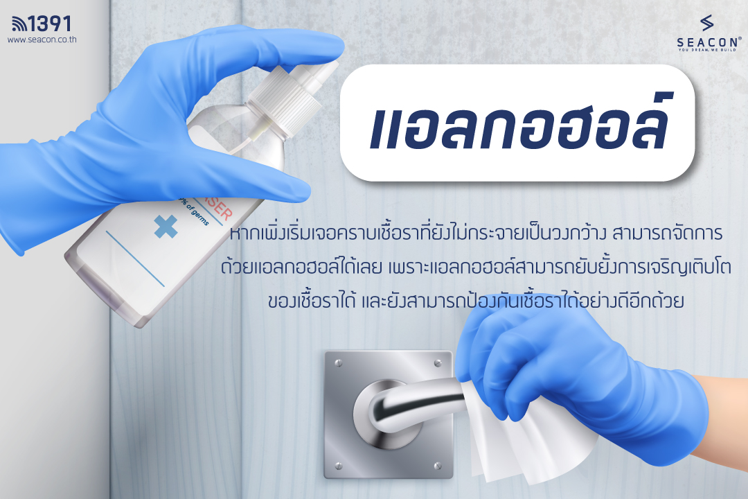 หากเพิ่งเริ่มเจอคราบเชื้อราที่ยังไม่กระจายเป็นวงกว้าง สามารถจัดการด้วยแอลกอฮอล์ได้เลย เพราะแอลกอฮอล์สามารถยับยั้งการเจริญเติบโตของเชื้อราได้ นอกจากขจัดคราบที่เพิ่งเจอตามซอกเล็ก ๆ น้อย ๆ ได้แล้ว ก็ยังช่วยป้องกันเชื้อราได้เป็นอย่างดีอีกด้วย