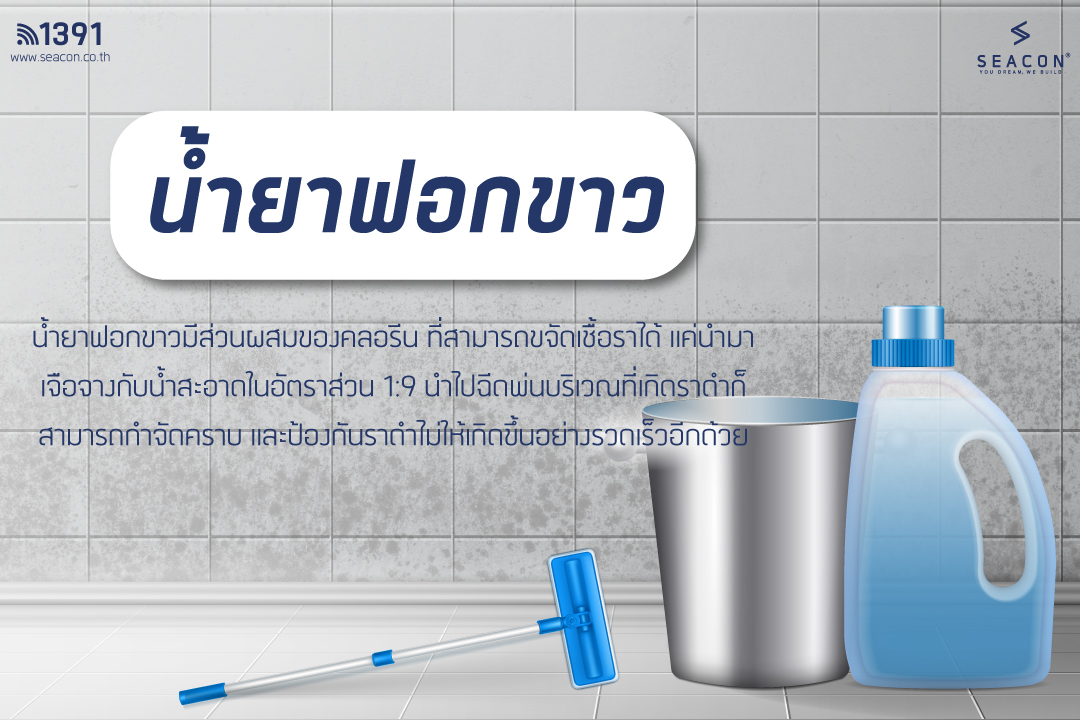 น้ำยาฟอกขาวที่นำมาซักทำความสะอาดเสื้อผ้า ก็เป็นอีกส่วนผสมที่หยิบมาทำความสะอาด คราบเชื้อราที่ติดอยู่ตามผนังบ้านได้ เพราะน้ำยาฟอกขาวนั้น มีส่วนผสมของคลอรีน ที่สามารถขจัดคราบเชื้อราได้ แค่นำมาเจือจางโดยการผสมเข้ากับน้ำสะอาดในอัตราส่วน 1:9 และใส่ขวดสเปรย์นำมาฉีดพ่นเป็นน้ำยาทำความสะอาด ก็จะสามารถช่วยสลายคราบ และป้องกันราดำไม่ให้เกิดขึ้นอย่างรวดเร็ว
