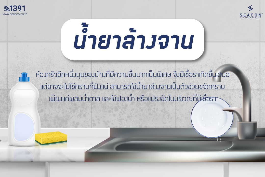 ห้องครัวอีกหนึ่งมุมของบ้านที่มีความชื้นมากเป็นพิเศษ จึงมีเชื้อราเกิดขึ้นเสมอ แต่อาจจะไม่ใช่คราบที่ฝังแน่น จึงสามารถใช้น้ำยาล้างจานขจัดคราบ เพียงแค่ผสมกับน้ำตาล และใช้ฟองน้ำ หรือแปรงขัดในบริเวณที่มีเชื้อรา
