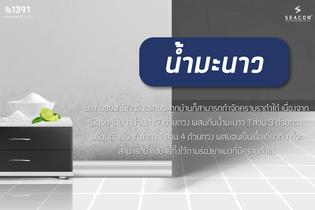 มะนาวถือเป็นอีกอย่างที่มีฤทธิ์เป็นกรด ช่วยเสริมในการขจัดคราบราดำได้ โดยนำน้ำเปล่า 7 ถ้วยตวง ผสมกับน้ำมะนาว ⅓ ถ้วยตวง พร้อมกับเบกกิ้งโซดาอย่างละ ¼ ถ้วยตวง เสร็จแล้วให้ผสมจนกลายเป็นเนื้อเดียวกัน ก็จะสามารถนำไปป้ายทิ้งไว้ตามร่องยาแนวที่มีคราบราดำ และใช้แปรงขัดออกให้สะอาด