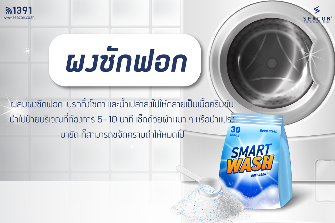นำผงซักฟอก และเบกกิ้งโซดามาผสมกัน พร้อมกับเติมน้ำเปล่าลงไปเล็กน้อย ให้กลายเป็นเนื้อครีมข้น นำไปป้ายทิ้งไว้ประมาณ 5-10 นาที และเช็ดออกด้วยผ้าหนา ๆ หรือนำแปรงมาขัด ก็สามารถขจัดคราบดำฝังลึกได้