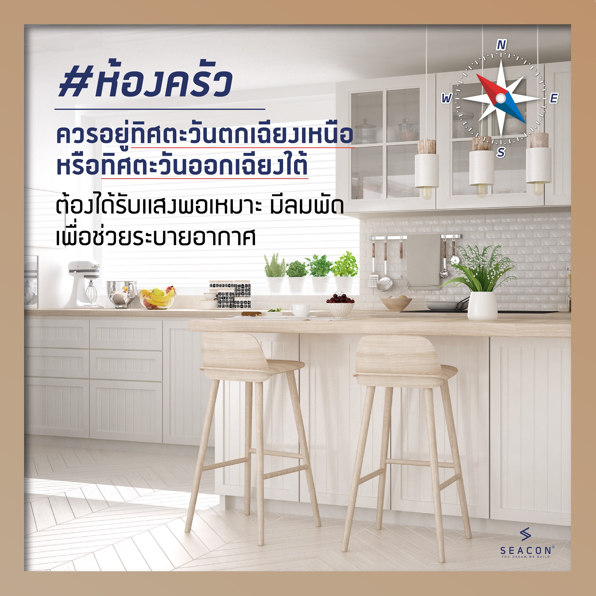 🥘ควรอยู่ในทิศที่ได้รับแสงในปริมาณที่พอเหมาะ และมีลมประจำผัดผ่าน เพื่อช่วยระบายกลิ่น และความอับชื้น ห้องครัวควรอยู่ทิศตะวันตกเฉียงเหนือเพื่อได้รับแสง หรือทิศตะวันออกเฉียงใต้เพื่อเป็นการระบายอากาศ แต่เพื่อความสะดวกต่อการใช้งาน ควรติดเครื่องดูดควันเข้ามาช่วยอีกแรงหนึ่งจะทำให้การใช้งานห้องครัวได้อย่างปลอดโปร่งมากยิ่งขึ้นครับ