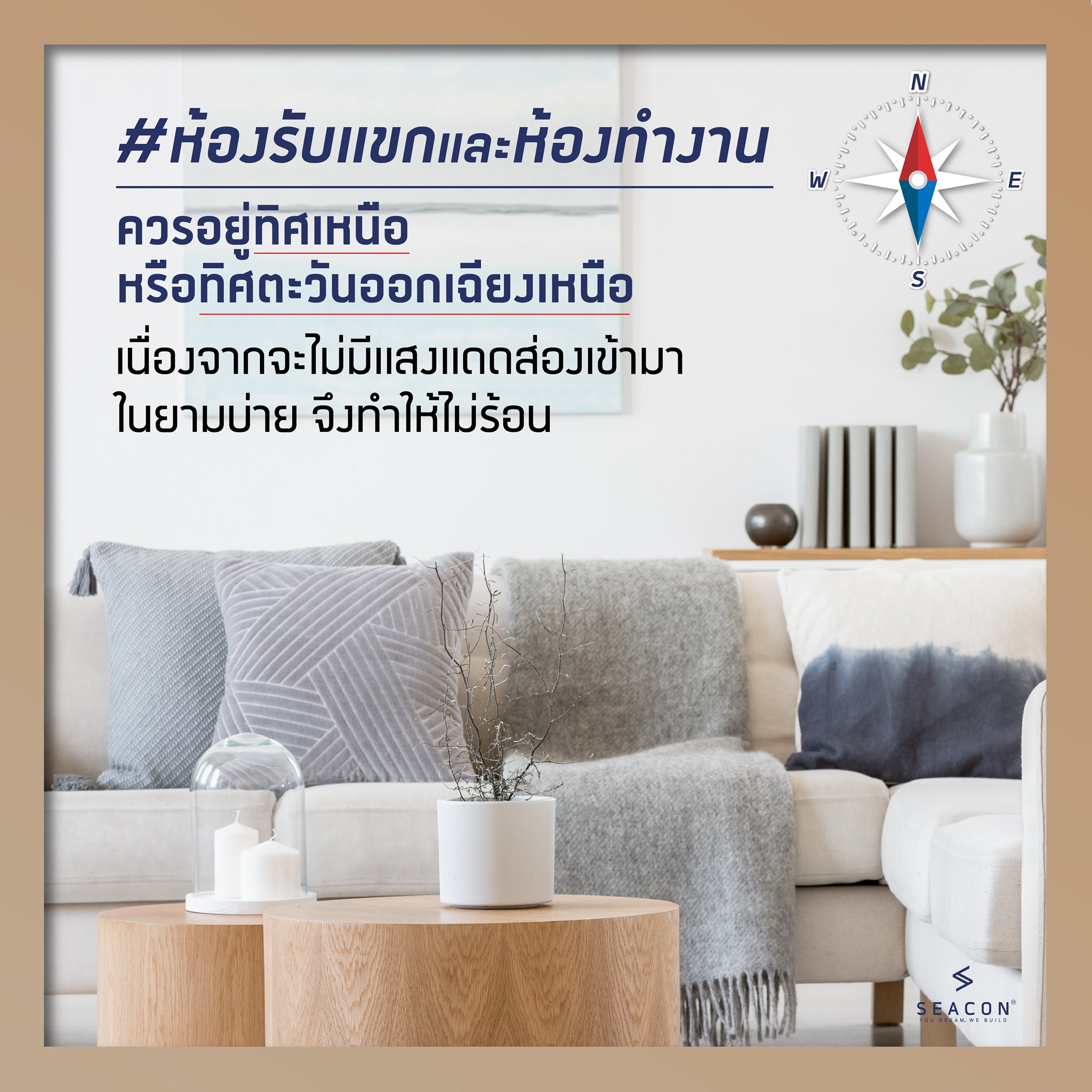 🖼🖌ควรอยู่ทางทิศเหนือหรือทิศตะวันออกเฉียงเหนือ เนื่องจากจะไม่มีแสงแดดส่องเข้ามาในยามบ่าย จึงทำให้ไม่ร้อน และสามารถนั่งพักผ่อนหรือทำงานได้ตลอดทั้งวัน แต่ทั้งนี้ห้องรับแขกที่ดีควรอยู่ส่วนหน้า เพื่อที่แขกไปใครมาจะได้สามารถใช้งานได้สะดวก สามารถมองเห็นวิว หรือบรรยากาศภายนอกได้ เพื่อให้แขกที่มาเยือนรู้สึกผ่อนคลาย