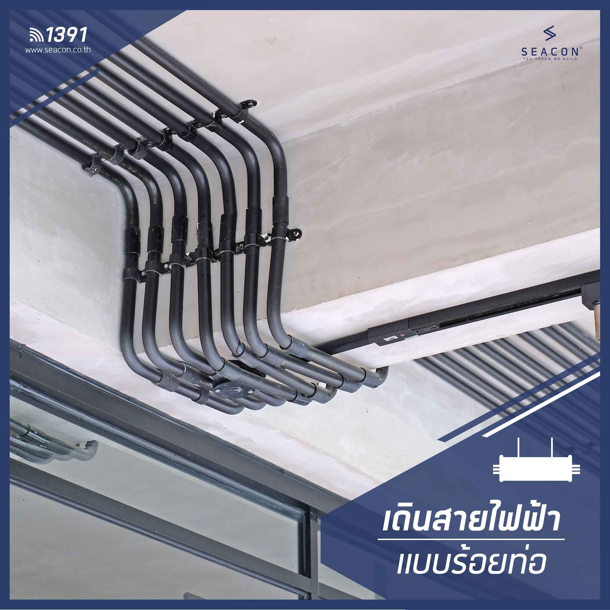 2. การเดินสายไฟแบบร้อยท่อ วิธีนี้จะเรียบร้อยกว่าการตีกิ๊บ เพราะสายไฟจะถูกร้อยเก็บไว้ในท่อ PVC หรือ ท่อเหล็ก แล้วยึดติดไปกับผนังของบ้าน ส่วนใหญ่บ้านสไตล์ลอฟท์ จะนิยมเดินสายไฟด้วยวิธีนี้