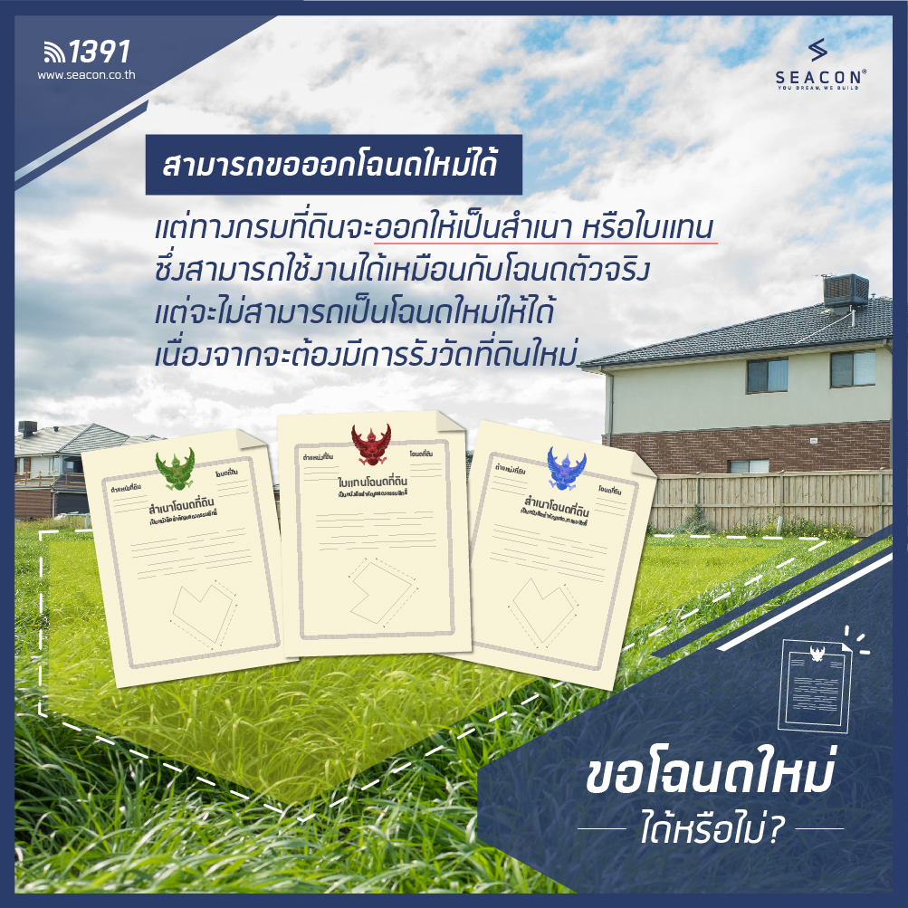 สามารถขอออกโฉนดใหม่กับ สำนักงานกรมที่ดิน ได้ครับ แต่ทางกรมที่ดินจะออกให้เป็นสำเนา หรือใบแทน ซึ่งสามารถใช้งานได้เหมือนกับโฉนดตัวจริงที่เราทำหายไปเลย สาเหตุที่ทางกรมที่ดินไม่สามารถออกโฉนดฉบับจริงให้ได้ เนื่องจากการออกโฉนดแต่ละครั้ง จะต้องมีการทำรังวัด ซึ่งทางกรมที่ดินจะออกโฉนดฉบับจริงให้กับทางเราหนึ่งฉบับ และกรมที่ดินเก็บไว้หนึ่งฉบับ ดังนั้นถ้าหากทำหาย ก็จะต้องออกเป็นใบแทนให้ครับ