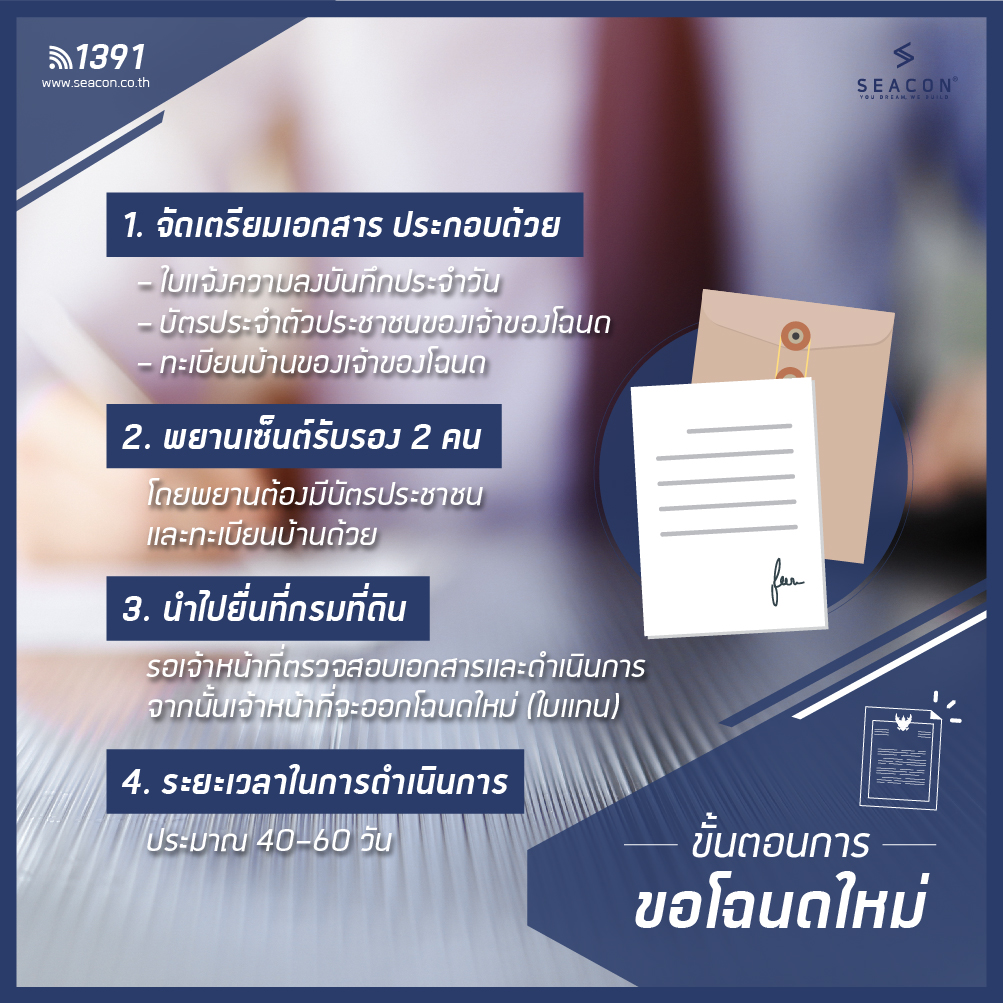 3. เมื่อเตรียมเอกสารครบแล้ว นำไปยื่นที่กรมที่ดิน เจ้าหน้าที่จะสอบสวนเจ้าของโฉนดและตรวจสอบเอกสารต่าง ๆ หากทุกอย่างเรียบร้อยก็จะลงบัญชีรับทำการ และตรวจอายัดโฉนดที่ทำหายไป เจ้าหน้าที่เขียนใบสั่งและใบเสร็จ พร้อมรับชำระค่าธรรมเนียม จากนั้นจะพิมพ์ใบประกาศ เพื่อนำไปปิดประกาศในที่เปิดเผย หากภายใน 30 วัน หลังจากปิดประกาศ ไม่มีผู้ใดคัดค้านหรือโต้แย้ง เจ้าหน้าที่จะออกโฉนดใหม่ (ใบแทน) และแจ้งให้เจ้าของโฉนดมารับในภายหลัง