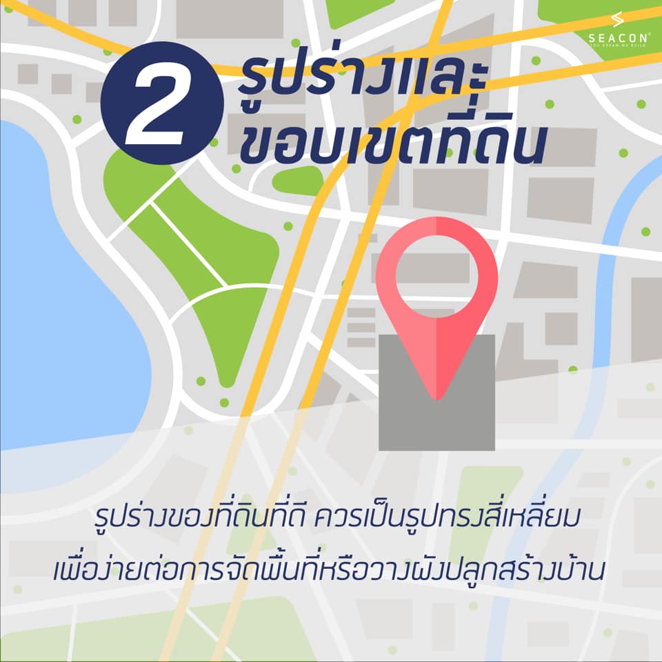 ต้องดูให้แน่ชัด รังวัดกันให้ดี ว่าขอบเขตที่ดินของเรานั้นมีแค่ไหน ใกล้เคียงกับอะไรบ้าง มีทางเข้าออกชัดเจน ไม่ใช่ที่ตาบอด และรูปร่างของที่ดินที่ดี ควรเป็นรูปทรงสี่เหลี่ยม เพื่อง่ายต่อการจัดพื้นที่หรือวางผังปลูกสร้างบ้าน