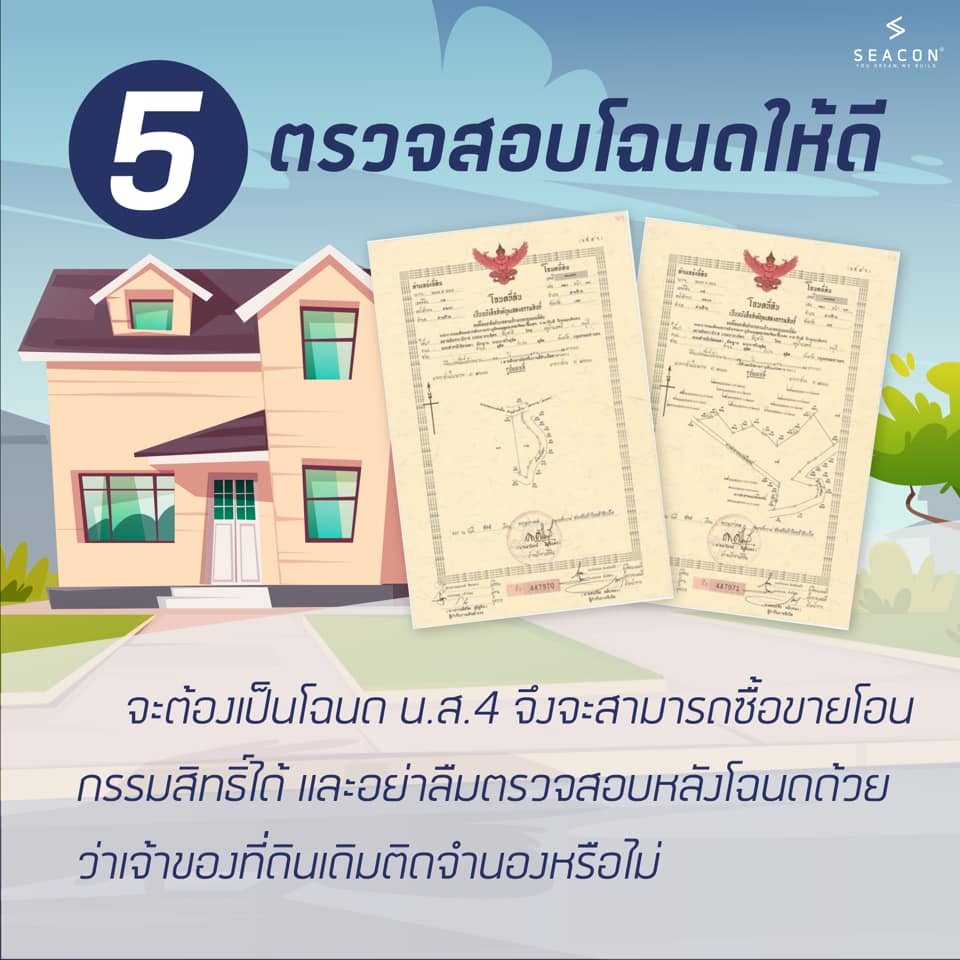 โฉนดที่ดินจะต้องเป็นโฉนด น.ส.4 จึงจะสามารถซื้อขายโอนกรรมสิทธิ์ได้ และอย่าลืมตรวจสอบหลังโฉนดด้วยว่าเจ้าของที่ดินเดิมติดจำนองหรือไม่ รวมทั้งต้องตรวจสอบกับกรมที่ดินให้แน่ชัดว่า ที่ดินผืนนี้โดนยึดหรือถูกอายัดไว้หรือเปล่า เพราะสิ่งนี้จะไม่มีอยู่ในโฉนด
