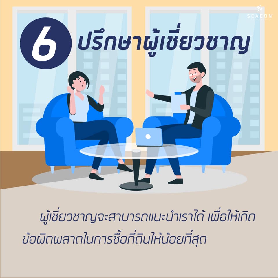อย่าลังเลที่จะปรึกษาผู้เชี่ยวชาญ เพราะยังมีอีกหลายด้านที่เราอาจไม่รู้ เช่น ด้านสถาปัตยกรรม หรือกฏหมาย ผู้เชี่ยวชาญจะสามารถแนะนำเราได้ เพื่อให้เกิดข้อผิดพลาดในการซื้อที่ดินให้น้อยที่สุด