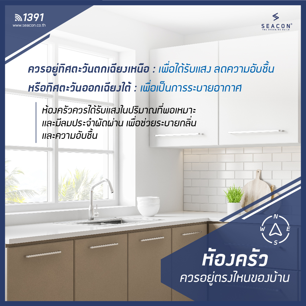 ควรอยู่ในทิศที่ได้รับแสงในปริมาณที่พอเหมาะ และมีลมประจำผัดผ่าน เพื่อช่วยระบายกลิ่น และความอับชื้น ห้องครัวควรอยู่ทิศตะวันตกเฉียงเหนือเพื่อได้รับแสง หรือทิศตะวันออกเฉียงใต้เพื่อเป็นการระบายอากาศที่ดี ทั้งนี้สามารถเพิ่มตัวช่วยในการระบายความร้อนและกลิ่นด้วยเครื่องดูดควันอีกทางหนึ่งครับ