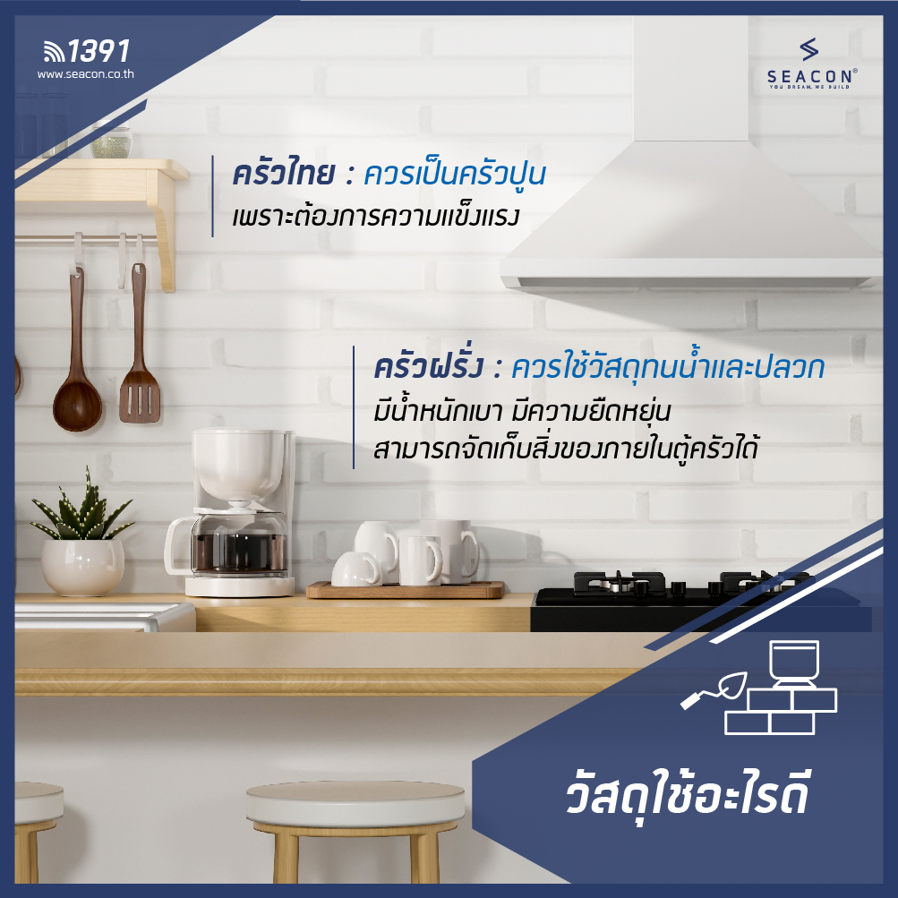ครัวไทย นิยมใช้เป็นครัวปูน เพราะต้องใช้ไฟแรง มีความร้อนในการปรุงอาหาร ชุดครัวจึงควรมีความแข็งแรง ทนน้ำ ทนร้อน จึงเป็นสาเหตุที่ว่าทำไม ครัวไทยถึงเรียกอีกแบบหนึ่งว่า ครัวนอกบ้าน นั้นเอง