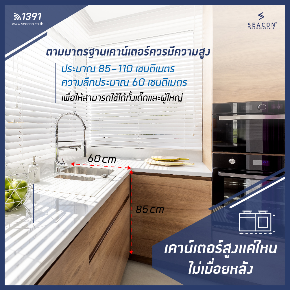 ตามมาตรฐานโดยทั่วไปแล้ว เคาน์เตอร์ควรมีความสูงประมาณ 85-110 เซนติเมตร และความลึกประมาณ 60 เซนติเมตร เพื่อให้สามารถใช้ได้ทั้งเด็กและผู้ใหญ่ ทั้งนี้ต้องดูจากความสูงของผู้ใช้งานเป็นสำคัญ หากผู้ใช้งานมีความสูงมากควรเพิ่มความสูงของเคาน์เตอร์ เพื่อให้สะดวกต่อการใช้งานและไม่ปวดหลัง วิธีง่าย ๆ คือ ให้ผู้ที่จะใช้ ลองก้ม ๆ เงย ๆ หยิบจับของใช้งานบนเคาน์เตอร์ดู ถ้ารู้สึกว่าศอกของเราพอดีไม่ติดขัด ก็เป็นความสูงที่พอเหมาะครับ