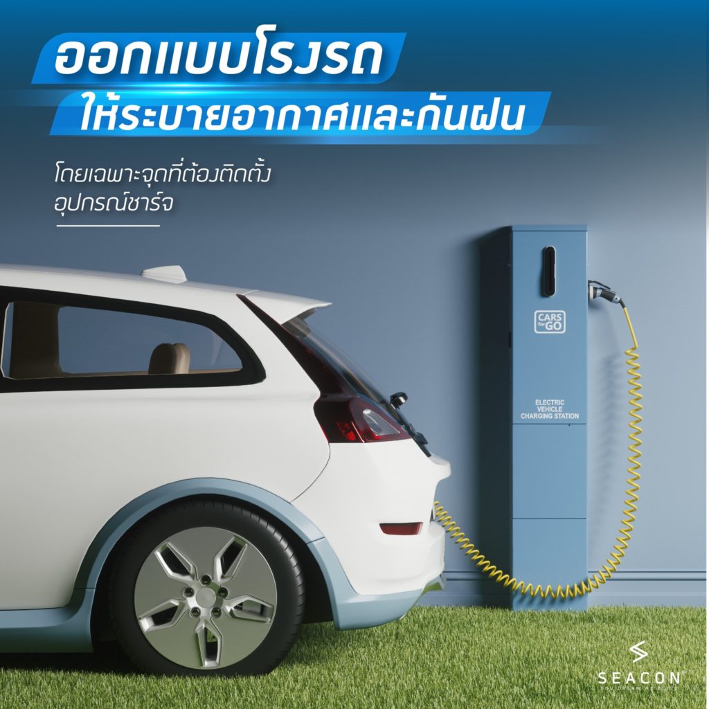 2. ออกแบบโรงรถให้มีการระบายอากาศที่ดี และสามารถกันฝนได้ดีโดยเฉพาะจุดที่ต้องติดตั้งอุปกรณ์ชาร์จ