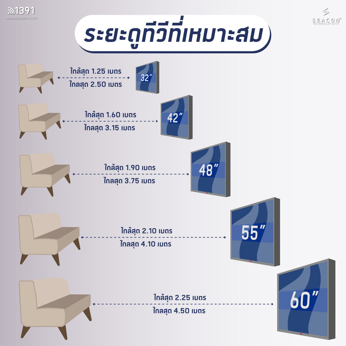 📺 ทีวีขนาด 32 นิ้ว ระยะนั่งใกล้สุด คือ 1.25 เมตร และระยะนั่งไกลสุด คือ 2.50 เมตร