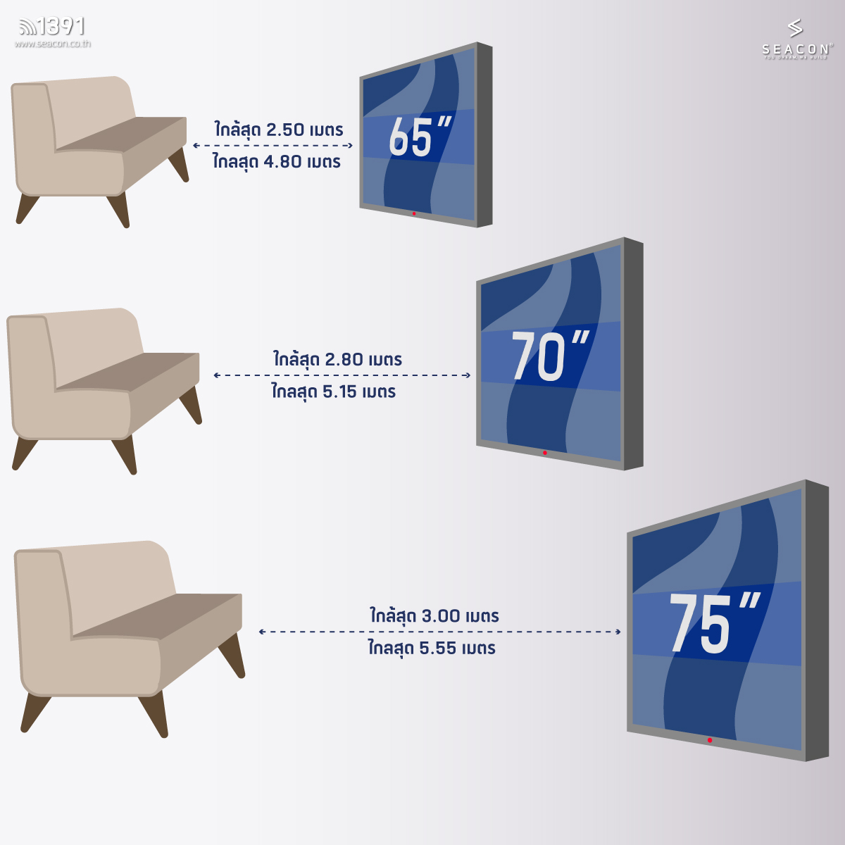 📺ทีวีขนาด 65 นิ้ว ระยะนั่งใกล้สุด คือ 2.50 เมตร และระยะนั่งไกลสุด คือ 4.80 เมตร