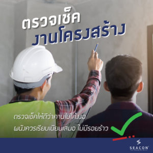 เสา คาน ผนัง ทุกอย่างที่เกี่ยวกับโครงสร้างต้องตรงตามสเปค ตรวจเช็คให้ดีว่าคานไม่โค้งงอ ผนังควรเรียบเนียนเสมอ ไม่มีรอยร้าว (ทั้งรอยเล็กและรอยใหญ่)