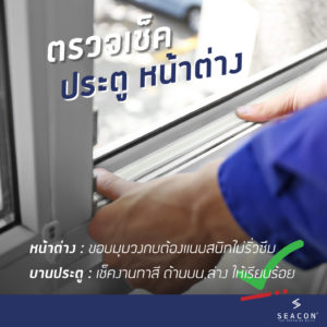 ขอบมุมวงกบต้องแนบสนิทไม่รั่วซึม สามารถทดสอบได้โดยการฉีดน้ำ แล้วดูว่าขอบวงกบมีน้ำรั่วซึมเข้าไปด้านในหรือไม่ หากมีต้องให้แก้ไข บานประตูลองส่องดูทั้งด้านบนด้านล่าง ว่าทาสีเรียบร้อยดีไหม