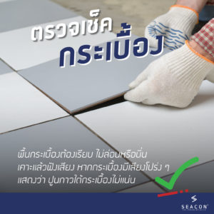 พื้นกระเบื้องต้องเรียบ ไม่ล่อนหรือบิ่น ลองเคาะแล้วฟังเสียงดู หากเคาะแล้วกระเบื้องมีเสียงโปร่ง ๆ หรือกระเบื้องสั่น นั่นแปลว่าปูนกาวใต้กระเบื้องไม่แน่น ควรเคาะตรวจเช็คให้ทั่วทั้งแผ่นและทุกแผ่น