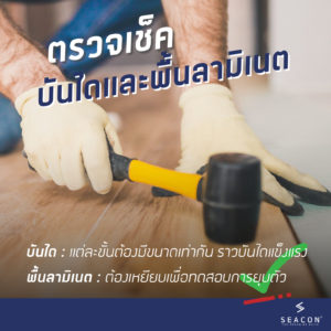 บันไดแต่ละขั้นต้องมีขนาดเท่ากัน ราวบันไดแข็งแรง สำหรับพื้นลามิเนท ลองเหยียบดูเพื่อทดสอบการยุบตัว หากเหยียบแล้วยุบตัวมากจนขึ้นมาเกยกันอันนี้ต้องสั่งแก้ทันทีครับ