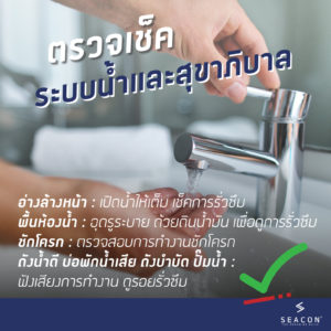 – อ่างล้างหน้า ให้ปิดท่อระบายน้ำแล้วเปิดน้ำให้เต็มอ่าง จากนั้นปล่อยน้ำทิ้ง เพื่อดูว่ามีรั่วหรือซึมตรงไหน เพราะบางทีการปล่อยน้ำไหล ๆ ไปอาจไม่เห็นรอยรั่วซึม