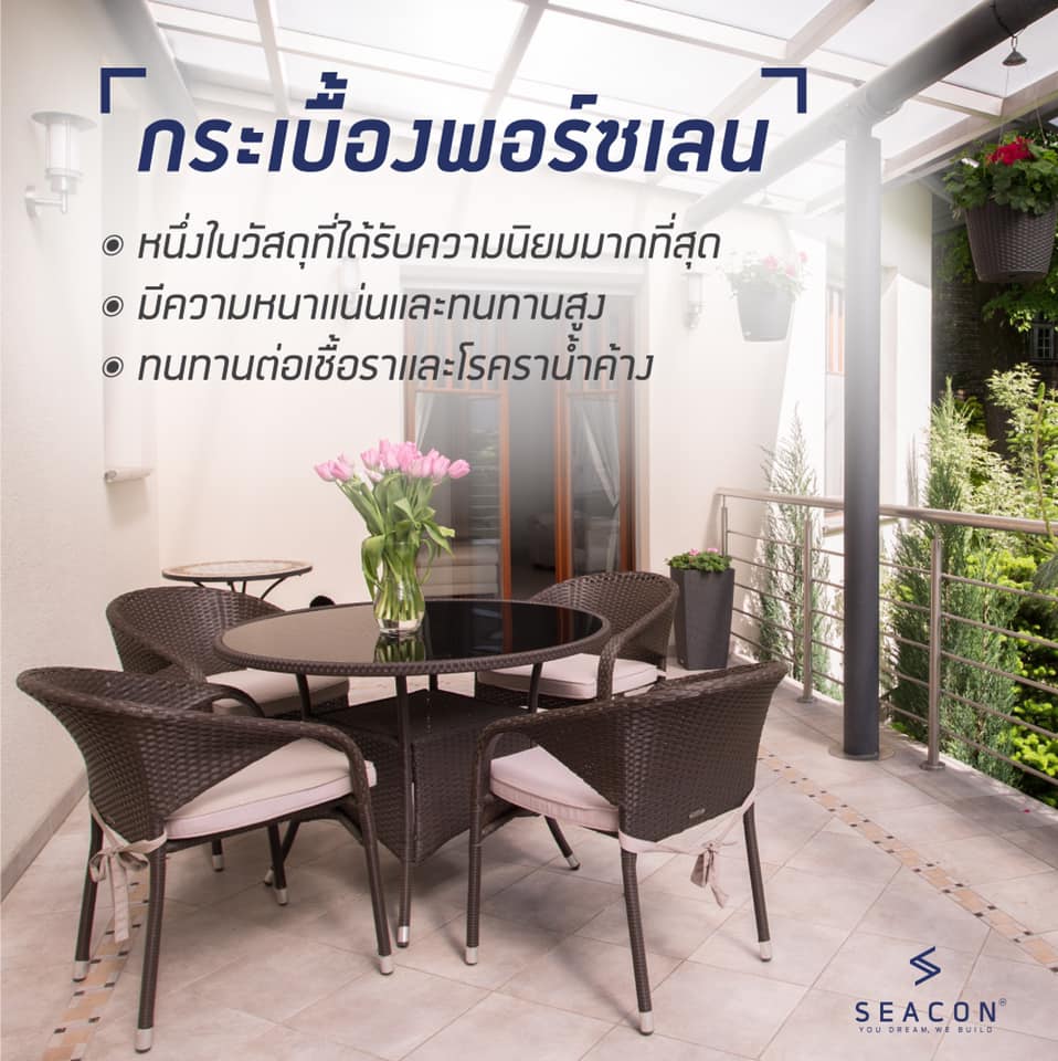 หนึ่งในวัสดุปูพื้นระเบียงที่ได้รับความนิยมมากที่สุด มีความหนาแน่นและทนทานสูง จึงเหมาะกับการใช้งานกลางแจ้ง ลักษณะที่ไม่มีรูพรุนของกระเบื้องช่วยป้องกันการดูดซึมน้ำ จึงทนทานต่อเชื้อราและราน้ำค้าง อย่างไรก็ตามควรเลือกกระเบื้องผิวด้านที่มีคุณสมบัติป้องกันการลื่น
