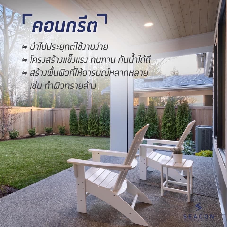 อีกหนึ่งในวัสดุสุดฮิตที่นำไปประยุกต์ใช้งานง่ายสุด ๆ นอกจากเป็นโครงสร้างที่แข็งแรง ทนทาน กันน้ำได้ดีแล้ว ยังสร้างพื้นผิวที่ให้อารมณ์หลากหลาย เช่น ทำผิวทรายล้าง คอนกรีตเปลือย คอนกรีตขัดมัน คอนกรีตพิมพ์ลาย ทั้งยังทาสีทับได้ เพื่อให้เกิดเฉลียงหรือชานที่หลากหลายตามตัวตนของผู้ที่ใช้งาน