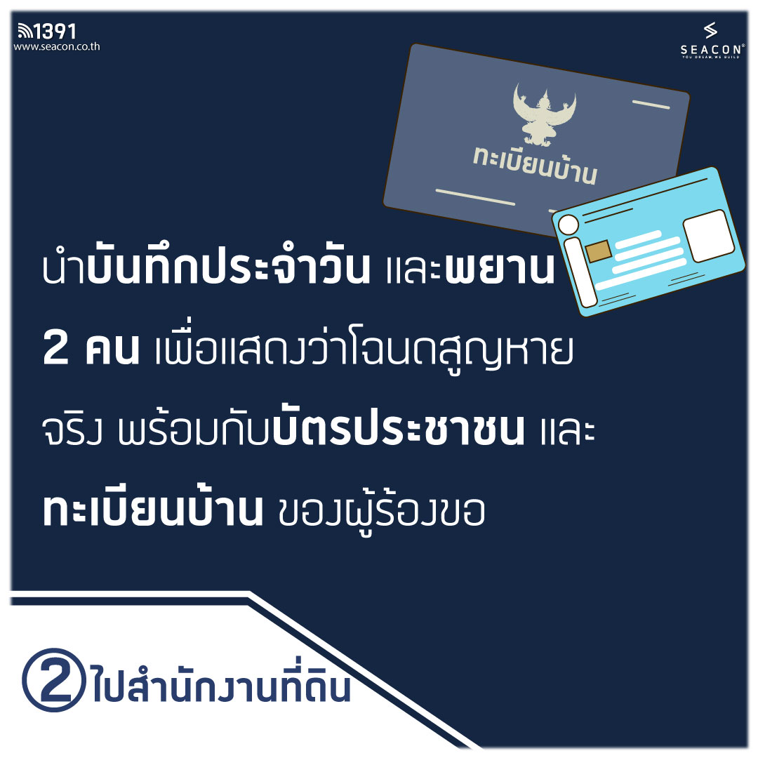 นำบันทึกประจำวันไปยื่นต่อสำนักงานที่ดิน และต้องมีพยานรับรอง 2 คน เพื่อรับรองว่าเราเป็นเจ้าของที่ดินนั้น ๆ โดยพยานอาจจะเป็นคนสนิท เช่น เพื่อนบ้านที่รู้จักเราเป็นอย่างดี และต้องนำบัตรประชาชน เพื่อไปแสดงต่อเจ้าหน้าที่ รวมถึงเอกสารรับรอง ซึ่งหากมีปัญหาภายหลังพยานทั้ง 2 คนจะต้องเป็นพยานในชั้นศาลด้วย