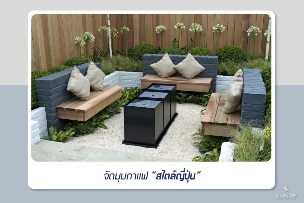มุมนี้ต้องมีการเคลียร์พื้นที่ของบ้านให้พร้อม แล้วตกแต่งโดยใช้หินกรวดโรยบริเวณพื้นที่รอบ ๆ ทำที่นั่งคล้ายกับเคาน์เตอร์เตี้ย ๆ พร้อมหมอนอิง อย่าลืมเพิ่มความร่มรื่นด้วยต้นไม้สวย ๆ และโต๊ะกลางสำหรับวางแก้วกาแฟ สำหรับยามบ่าย หรือในวันที่อากาศดี ๆ นะครับ