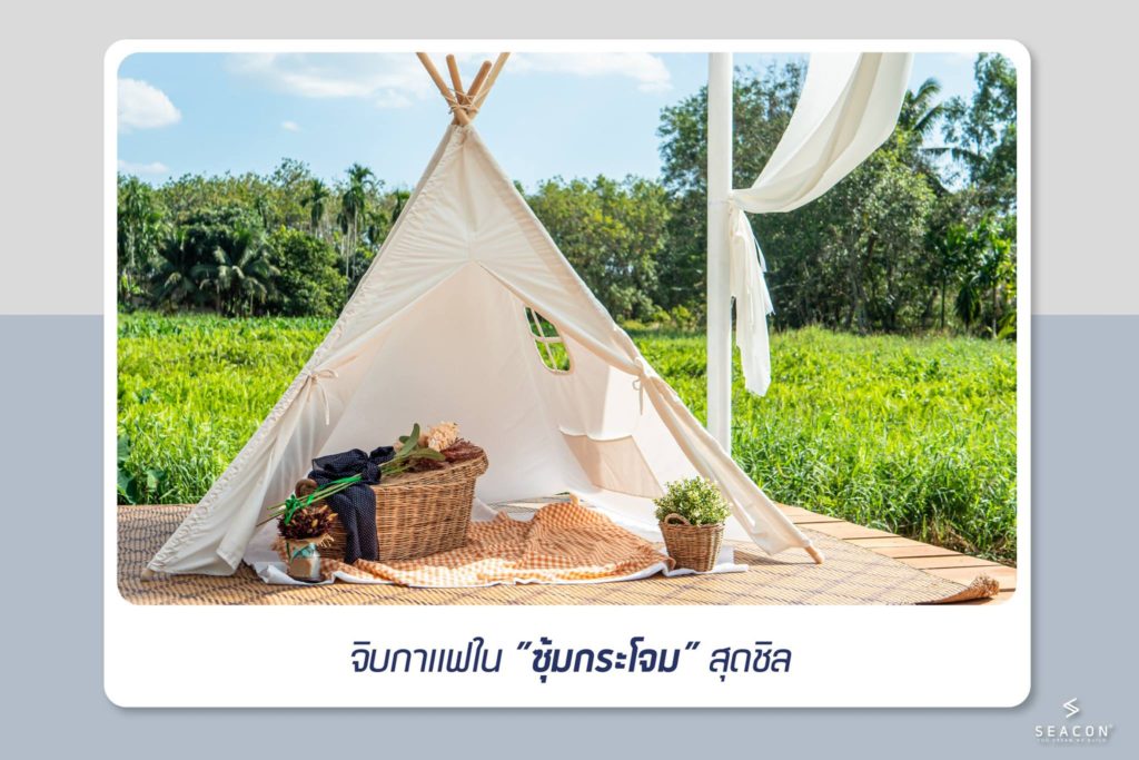 สำหรับคนที่มีบ้านพักตากอากาศ ได้สัมผัสกับวิวทุ่งนา หรือทุ่งหญ้าสีเขียวแล้วละก็ เพียงแค่จัดเป็นซุ้มกระโจมสีขาว มีผ้าสวย ๆ ปูพื้นสักผืน แค่นี้ก็นั่งจิบกาแฟได้แบบชิลสุด ๆ แล้วล่ะครับ