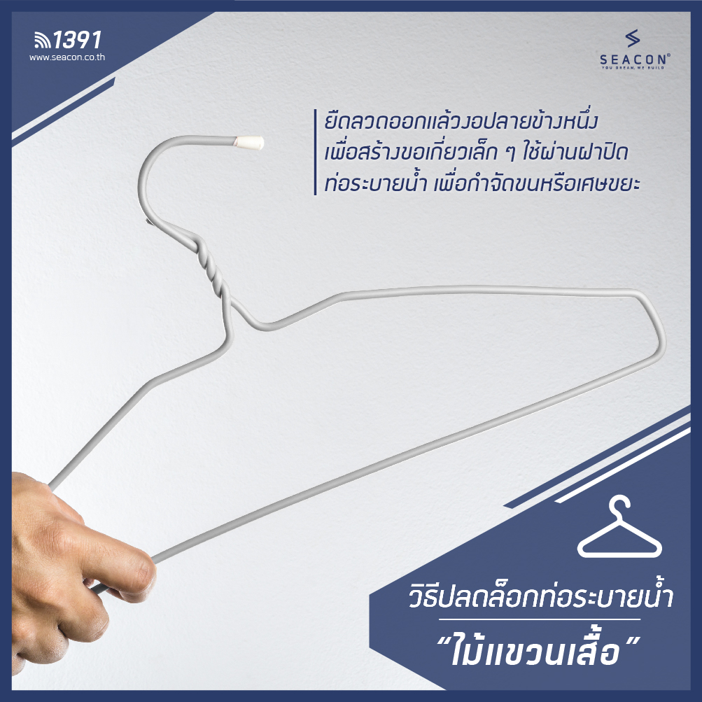 1.”ไม้แขวนเสื้อ” ยืดไม้แขวนเสื้อลวดออกแล้วงอปลายข้างหนึ่งเพื่อสร้างขอเกี่ยวเล็ก ๆ ใช้ผ่านฝาปิดท่อระบายน้ำเพื่อกำจัดขนหรือเศษขยะ หลังจากนั้นให้เทน้ำร้อนลงไป ให้ทุกอย่างเคลื่อนไหวได้อย่างอิสระอีกครั้ง เทคนิคนี้จะได้ผลดีที่สุดเมื่อสิ่งอุดตันอยู่ในระยะ 5 ซม.–10ซม. แรกของท่อระบายน้ำ