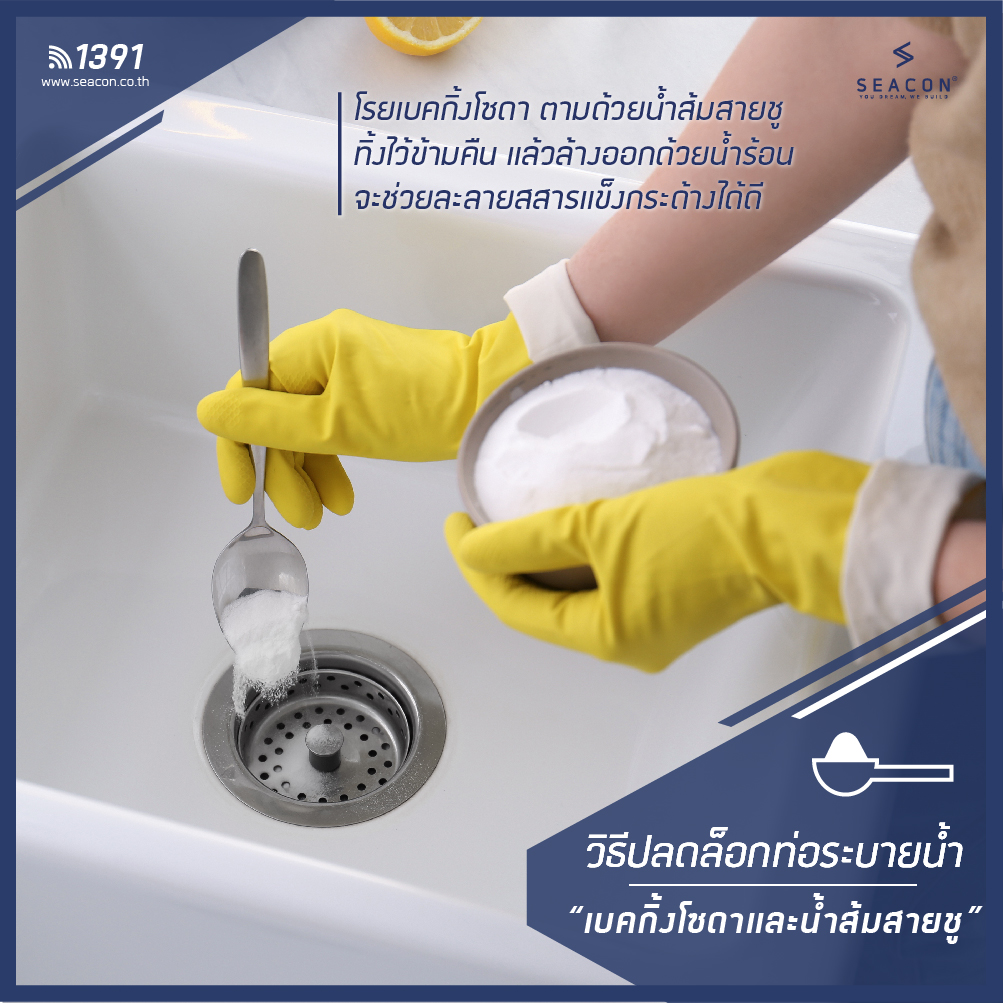 5.“เบคกิ้งโซดาและน้ำส้มสายชู” โรยเบคกิ้งโซดาลงในท่อระบายน้ำ ตามด้วยน้ำส้มสายชูในปริมาณที่เหมาะสม ทางที่ดีควรทิ้งไว้ค้างคืนแล้วล้างออกด้วยน้ำร้อนในตอนเช้า วิธีนี้มีประสิทธิภาพในการทำลายสสารที่แข็งกระด้าง และแข็งขึ้นเมื่อเวลาผ่านไป