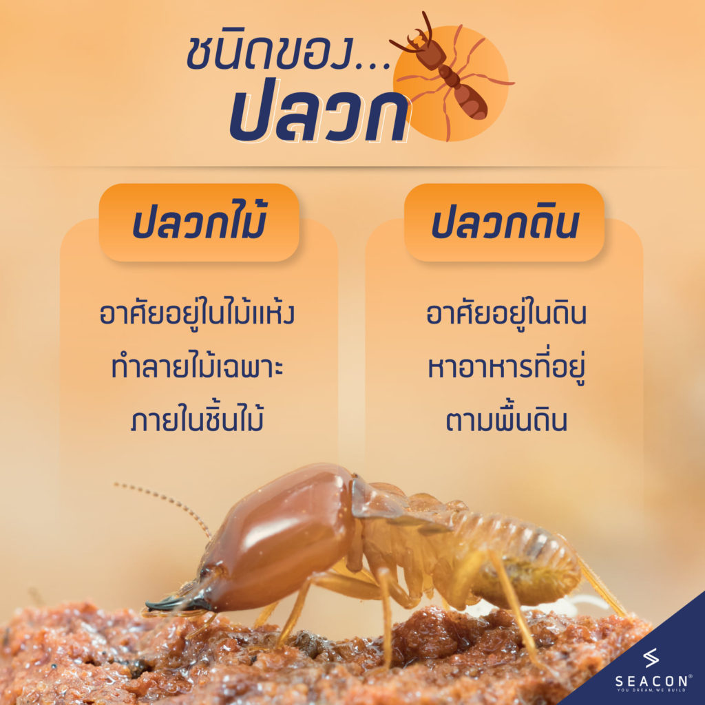 ปลวกมีหลายชนิด สามารถแบ่งเป็นกลุ่มใหญ่ได้ 2 ประเภท คือ ปลวกไม้ และปลวกดิน “ปลวกไม้” มักอาศัยอยู่ในไม้ที่แห้งหรือไม้ที่มีอายุการใช้งานมานานและมีความชื้นต่ำ โดยทั่วไปปลวกชนิดนี้จะทำลายไม้เฉพาะภายในชิ้นไม้โดยเหลือผิวไม้ด้านนอกเป็นฟิล์มบาง ๆ ไว้ ทำให้มองดูภายนอกเหมือนไม้ยังอยู่ในสภาพดี “ปลวกดิน” จะอาศัยอยู่ในดินแล้วออกไปหาอาหารที่อยู่ตามพื้นดิน หรือเหนือพื้นดินทั่วไป โดยส่วนใหญ่จะทำท่อทางเดิน เดินห่อหุ้มตัว เพื่อป้องกันการสูญเสียความชื้น และหลบซ่อนตัวจากศัตรูที่มารบกวน