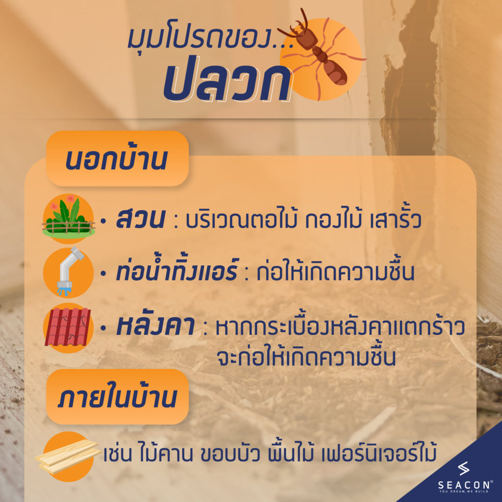 – สวน ไม่ว่าจะเป็นบริเวณตอไม้ กองไม้ เสารั้วที่สัมผัสดิน เป็นแหล่งรวมความชื้น จึงเป็นแหล่งอาหารชั้นดีของปลวกด้วยเช่นกัน
