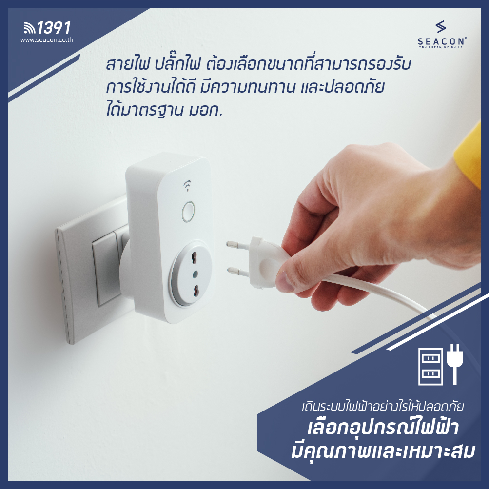 1. เลือกอุปกรณ์ไฟฟ้าที่มีคุณภาพและเหมาะสม เช่น สายไฟ ปลั๊กไฟ ต้องเลือกขนาดที่สามารถรองรับการใช้งานได้ มีความทนทาน และปลอดภัยที่จะใช้งาน ได้มาตรฐาน มอก.
