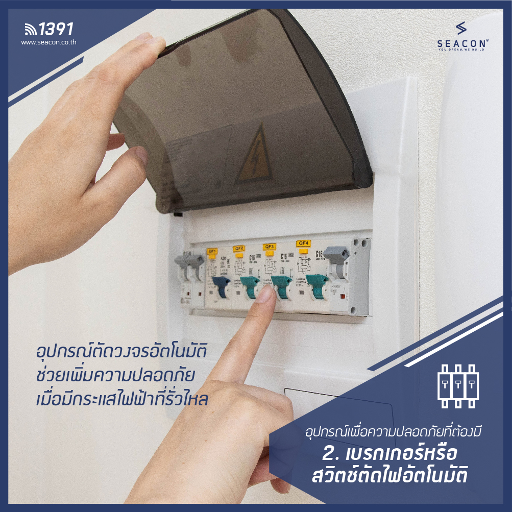 2. เบรกเกอร์หรือสวิตช์ตัดไฟอัตโนมัติ การติดตั้งอุปกรณ์ตัดวงจรอัตโนมัติ เป็นส่วนหนึ่งที่ช่วยเพิ่มความปลอดภัย เมื่อมีกระแสไฟฟ้าที่รั่วไหลออกจากเครื่องใช้ไฟฟ้า กระแสไฟฟ้าลัดวงจร หรือมีกระแสไฟฟ้าไหลลงดิน โดยผ่านตัวนำหรือร่างกาย อุปกรณ์นี้จะตัดวงจรทันที ทำให้ผู้ใช้งานไม่ได้รับอันตรายจากกระแสไฟฟ้ารั่วไหลนั่นเอง
