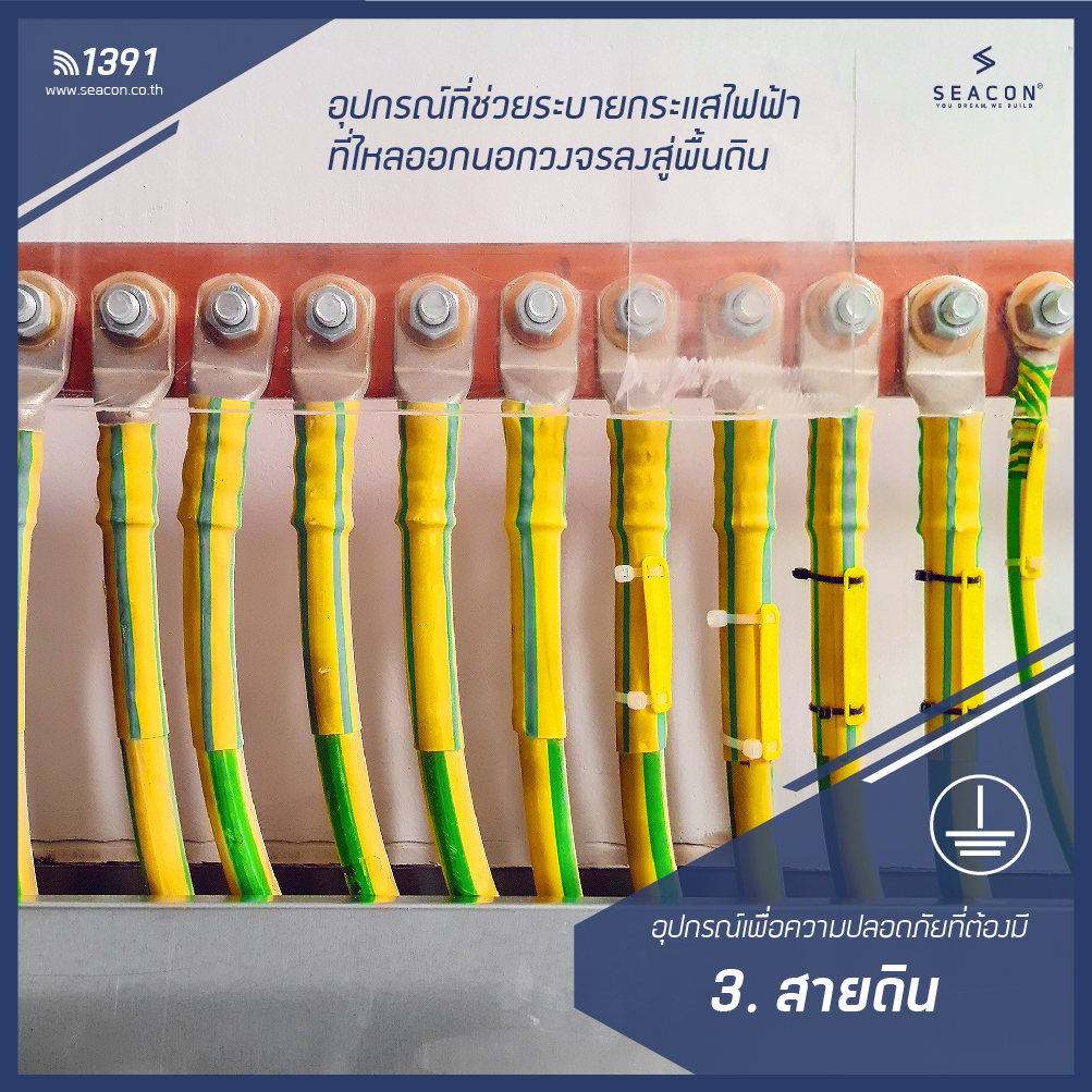 3. สายดิน เป็นอุปกรณ์ที่ช่วยระบายกระแสไฟฟ้าที่ไหลออกนอกวงจรลงสู่พื้นดิน สายดิน จะช่วยลดอันตรายที่จะเกิดขึ้นกับร่างกาย หรือภายในวงจร โดยที่สายดินจะติดตั้งไว้อยู่ที่เมนไฟ และมักจะทำงานคู่กับอุปกรณ์ตัดวงจรอัตโนมัติ เช่น เบรกเกอร์