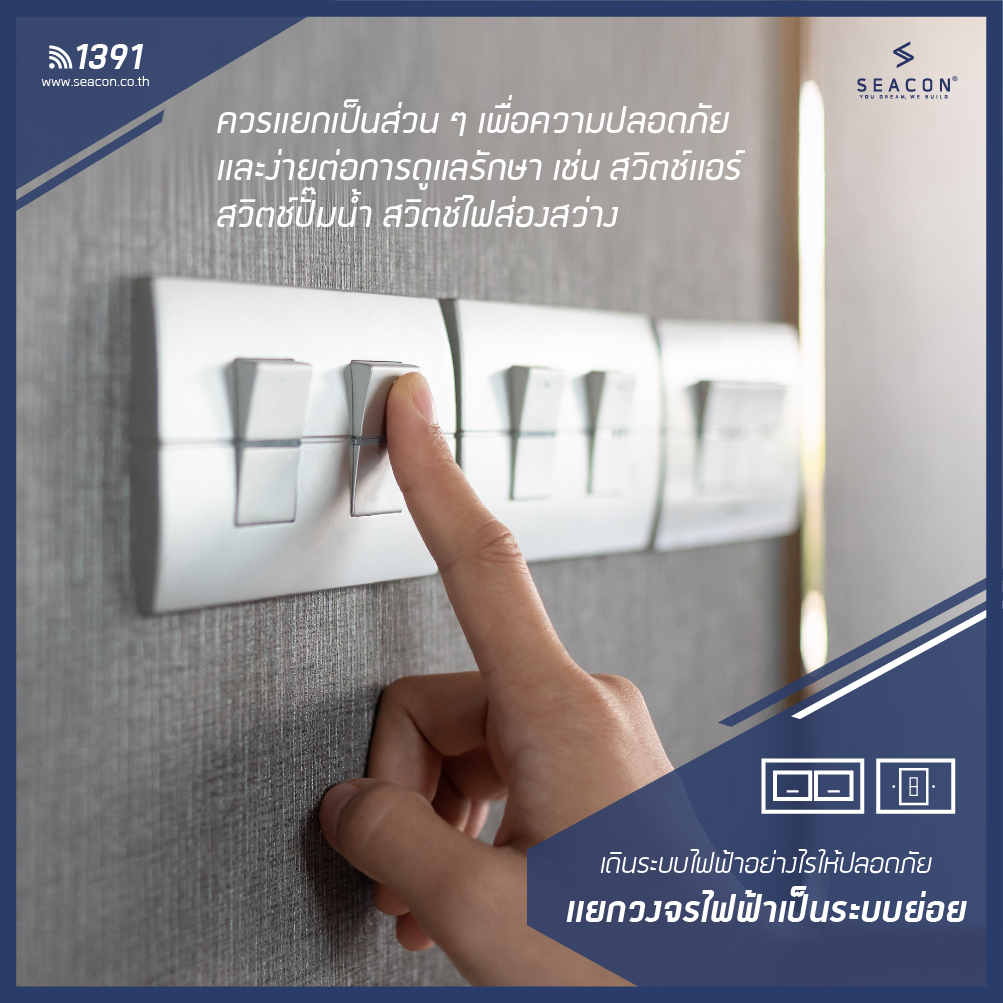 2. แยกวงจรไฟฟ้าเป็นระบบย่อย ไม่ควรเดินทุกอย่างให้อยู่ภายในสวิตช์เดียว ควรแยกเป็นส่วน ๆ เพื่อความปลอดภัย และง่ายต่อการดูแลรักษา เช่น สวิตช์แอร์ สวิตช์ปั๊มน้ำ สวิตช์ไฟส่องสว่าง เป็นต้น