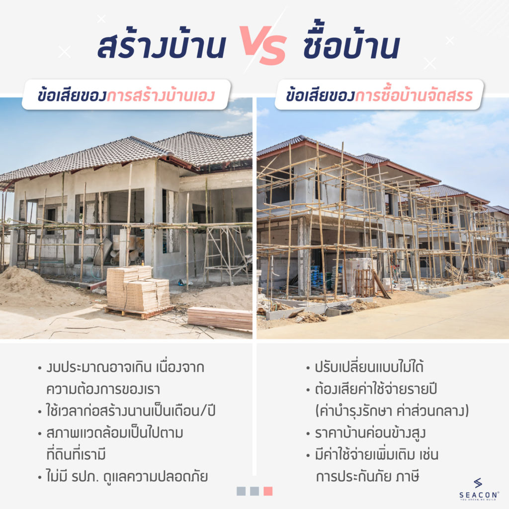 คำถามที่มักจะมาเป็นคำถามแรก ๆ ของคนที่กำลังคิดจะมีบ้าน นั่นคือ สร้างบ้านเอง หรือซื้อบ้านจัดสรรแบบไหนดีกว่ากัน คำตอบขึ้นอยู่กับหลายปัจจัย ทั้งงบประมาณ สถานที่ แบบ และอื่นๆ อีกมากมาย เอาเป็นว่าลองพิจารณาจากข้อดีข้อเสียเหล่านี้ดูก่อนนะครับ