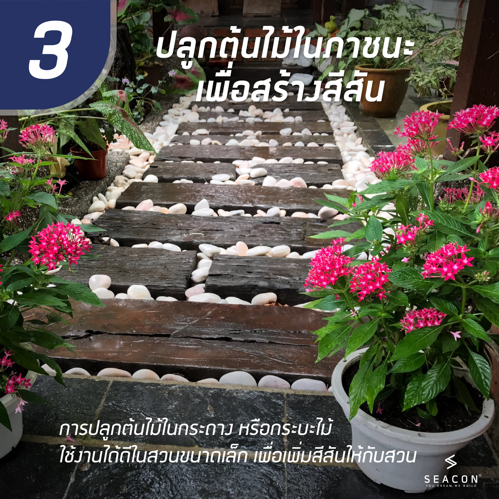 3. ปลูกต้นไม้ในภาชนะเพื่อสร้างสีสันและความน่าสนใจ